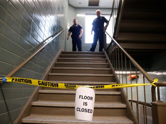 A crew working on the building's second floor called 911 at 2:52 p.m. Wednesday. Workers had been using equipment to lift and place a piece of limestone above an interior doorway when the rock fell, preliminary reports said.