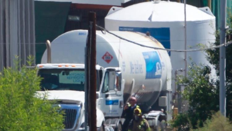 Hydrogen gas flashed over and leaked from a truck's tank at an El Cajon business on Wednesday, prompting evacuations from other businesses, residences and schools for two blocks. (John Gibbins/ San Diego Union-Tribune)
