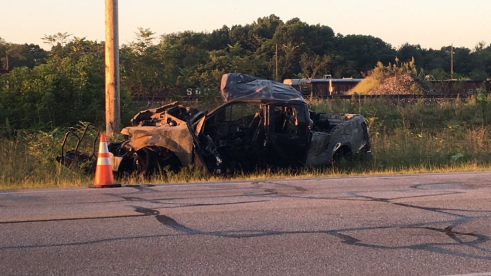 A passing freight train hit the truck. The truck burst into flames.