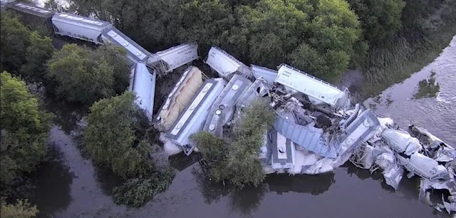 No injuries were reported after a train derailed in Iowa and 20 cars carrying soybean oil and sand fell into the flooded Floyd River.